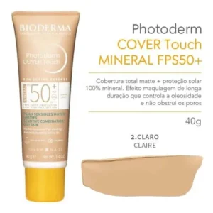 Photoderm Cover Touch FPS 50+ é a 1ª² proteção mineral com cobertura total¹ especialmente formulada para peles oleosas. Sua textura revolucionária oferece proteção e cobertura de longa duração em uma fórmula leve e minimalista que deixa a pele respirar, mantendo-a uniforme, confortável e livre de oleosidade o dia todo³. Com filtros e pigmentos 100% físicos e minerais, Photoderm Cover Touch FPS 50+oferece muito alta proteção contra a radiação UVB, UVA e luz visível. Dia após dia, Photoderm Cover Touch FPS 50+ reduz a oleosidade³ através da patente Fluidactiv™, prevenindo o surgimento de novos cravos e espinhas. Textura revolucionária: Tecnologia com pigmentos que se dispersam perfeitamente para uma cobertura total que não obstrui os poros, não craquela e não acumula em linhas de expressão. Alta fixação mesmo em condições extremas: fórmula muito resistente à água, suor e calor. Não transfere4 e não derrete ao longo do dia, com 08h de efeito base com controle do brilho e da oleosidade³. Sobre a marca: Na BIODERMA a pele é nossa paixão, nossa expertise, nosso modelo. É observando a biologia da pele e analisando o que ela faz de melhor que nós encontramos a inspiração para criar cuidados dermatológicos que restauram e fortalecem o equilíbrio natural da pele, preservando sua saúde e a beleza de forma duradoura.